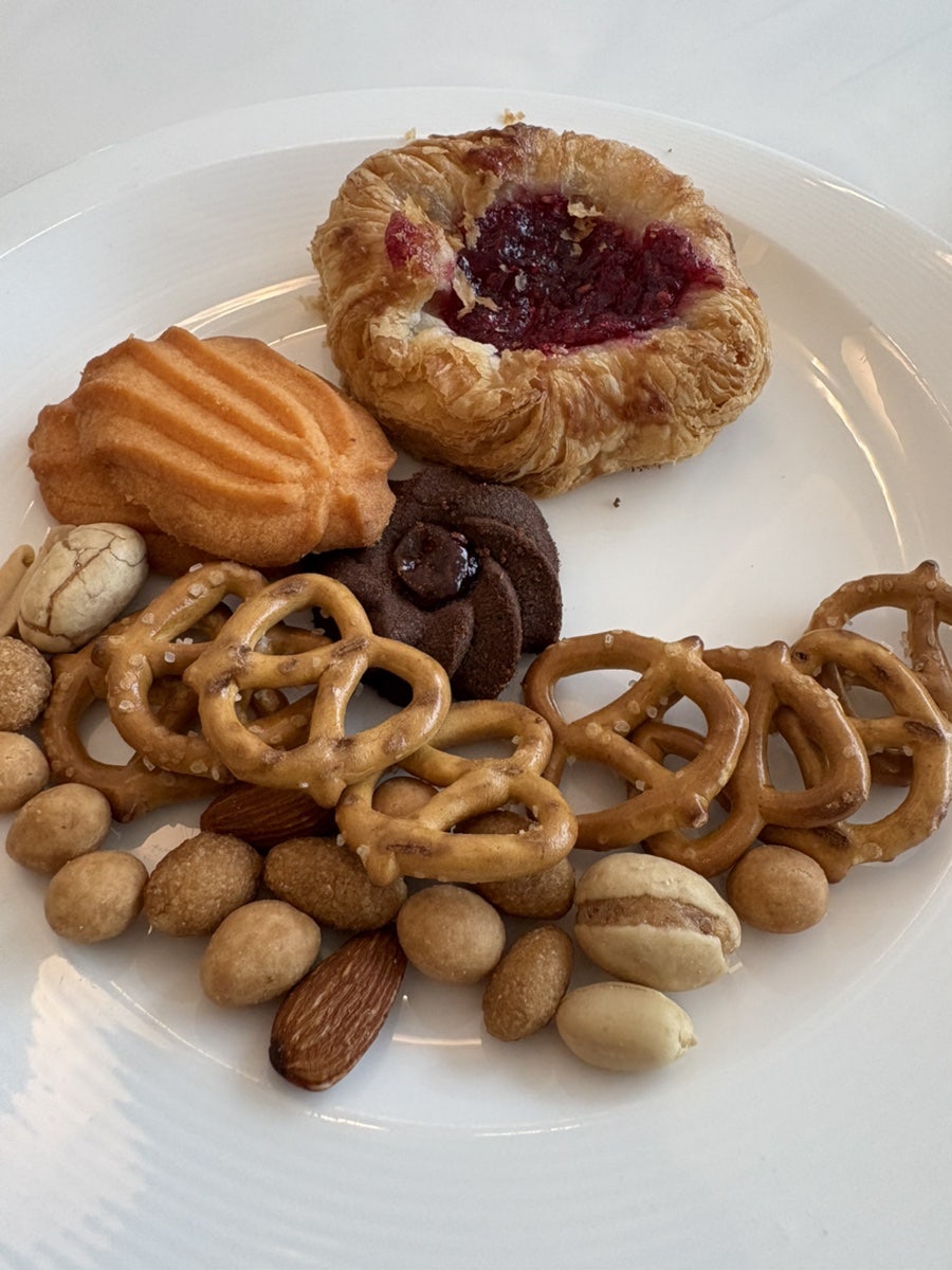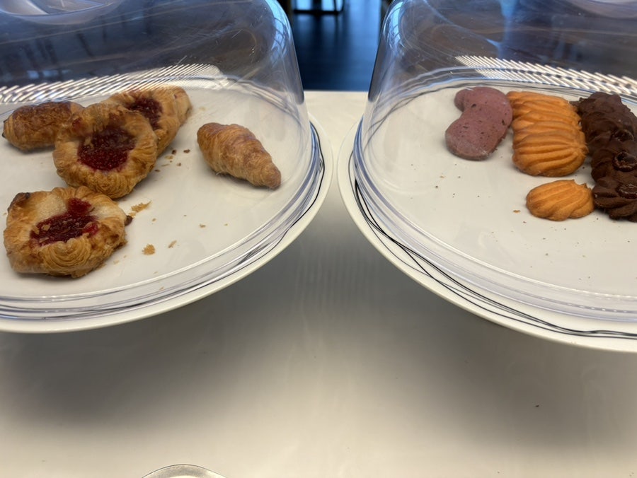 과자, 빵, 쿠키류와 과일, 음료, 커피등