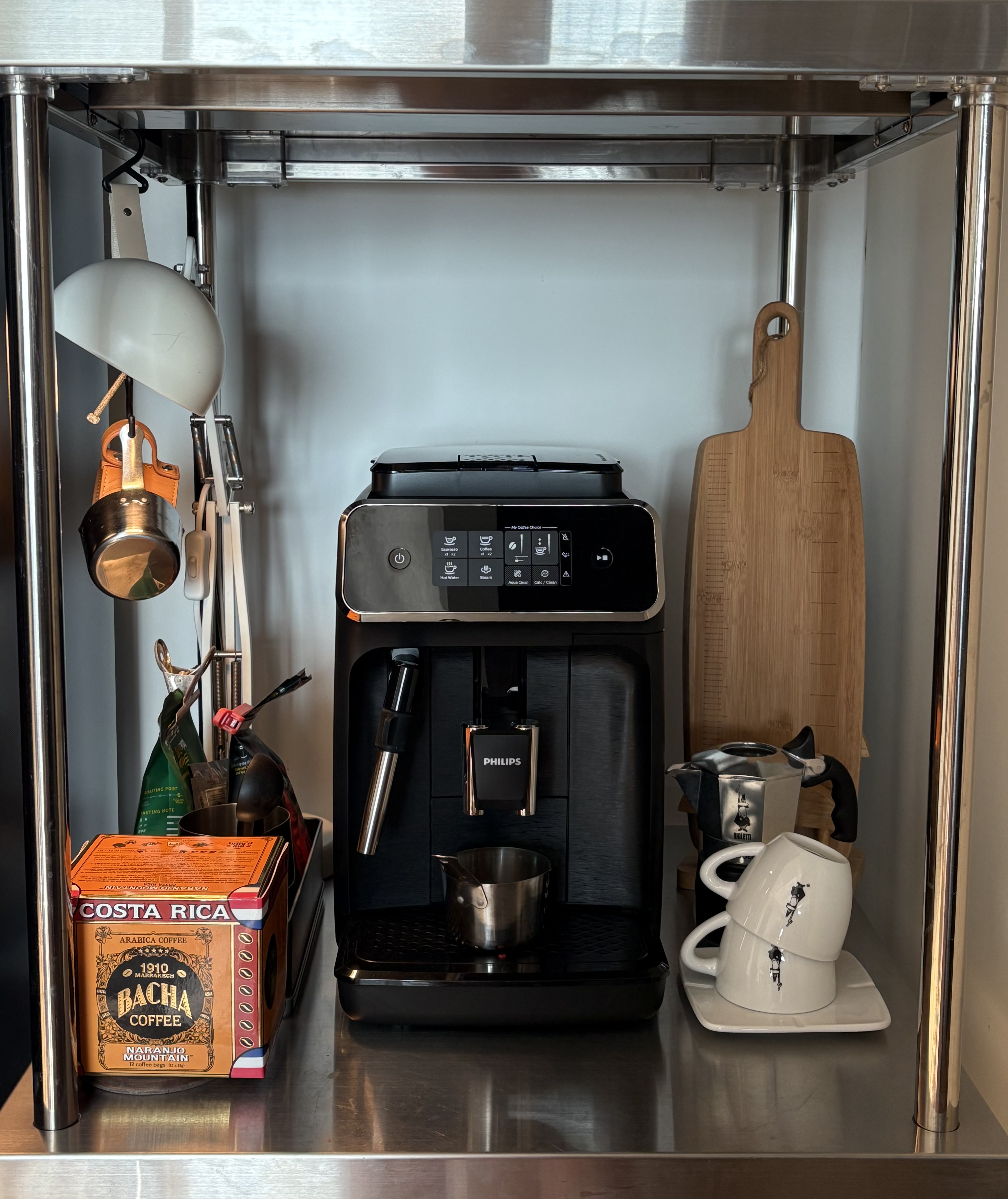 1.물받이와 커피 가루통, 물통, 스팀봉 등을 맞춘다.